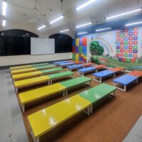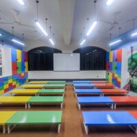 The design emphasizes engagement and encouragement through vibrant colors and stimulating educational elements. By having the students sit on the ground, the space remains versatile, accommodating various activities and group work. Each student has an assigned drawer to store their belongings, eliminating the need to bring study materials home. This setup fosters a sense of responsibility and organization. The use of bright, lively colors is intended to stimulate the children’s minds, making learning and activities more engaging and enjoyable.