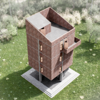 The structure features a bold combination of exposed brickwork and geometric precision, highlighting its timeless yet modern appeal. Elevated on stilts, the design not only enhances its visual impact but also ensures environmental sensitivity by minimizing the footprint. This prototype serves as a versatile and sustainable solution for showcasing exhibitions and events, reflecting the innovative vision of Bangladesh Bank.