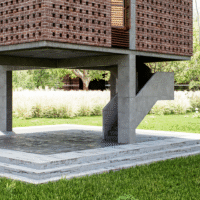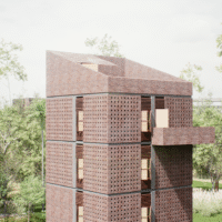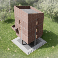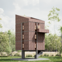 The structure features a bold combination of exposed brickwork and geometric precision, highlighting its timeless yet modern appeal. Elevated on stilts, the design not only enhances its visual impact but also ensures environmental sensitivity by minimizing the footprint. This prototype serves as a versatile and sustainable solution for showcasing exhibitions and events, reflecting the innovative vision of Bangladesh Bank.
